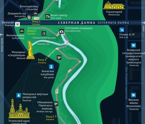 Экологичные решения применяются не только к самому зданию визит-центра. Вдоль реки Егошихи, на площадке, предназначенной для выгула собак, устанавливаются опоры освещения, оснащенные солнечными модулями. Эти новые фонари способны работать полностью автономно, используя лишь энергию солнца для зарядки аккумуляторов в дневное время и освещая территорию ночью, что исключает необходимость подключения к централизованным электросетям и экономит ресурсы.